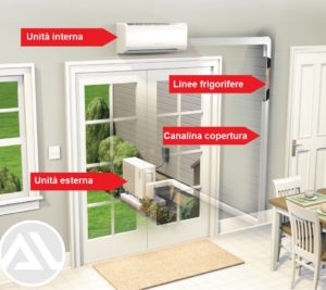 Le unità interne possono essere di vari tipi: a parete, a pavimento, a soffitto, a controsoffitto. È buona norma installarle in modo che l’aria non arrivi in maniera troppo diretta sulle persone.