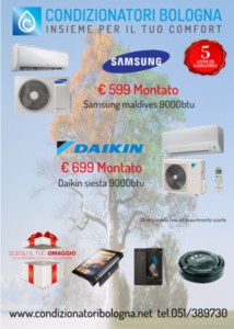 Nel volantino puoi vedere alcune delle nostre promozioni su condizionatori Daikin e Samsung. Tutti i prodotti da noi installati prevedono una garanzia gratuita di 5 anni. Al termine della lavorazione eseguiamo un regolare collaudo dell’impianto, rilasciando la dichiarazione di conformità ed il libretto di impianto.